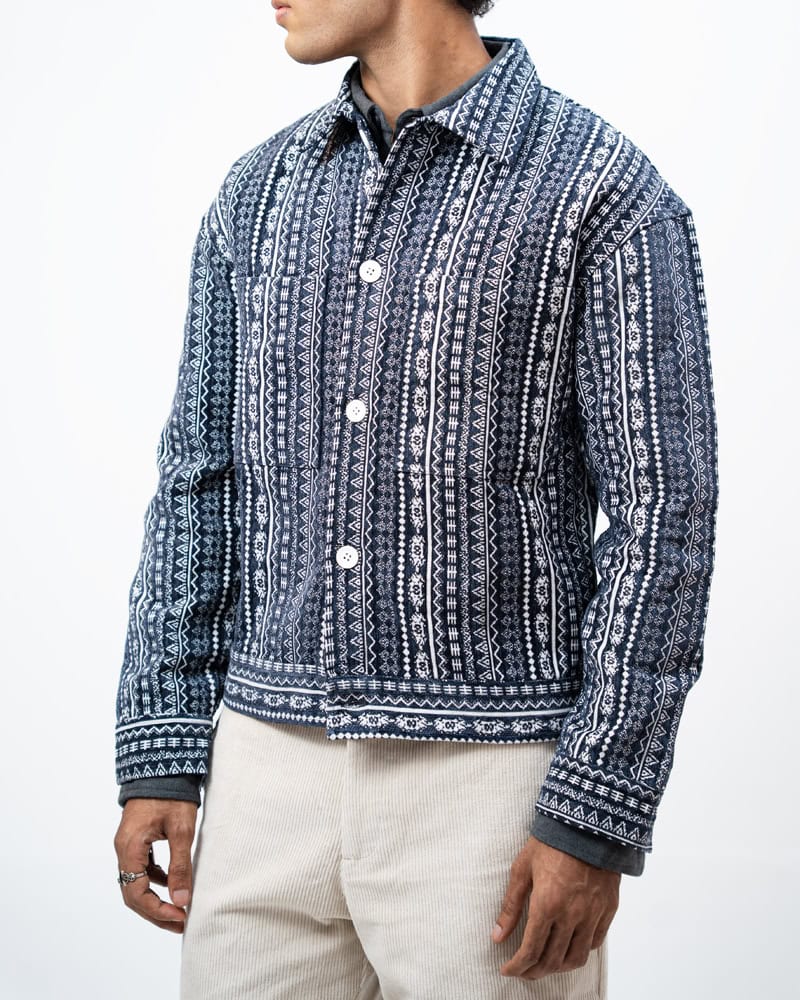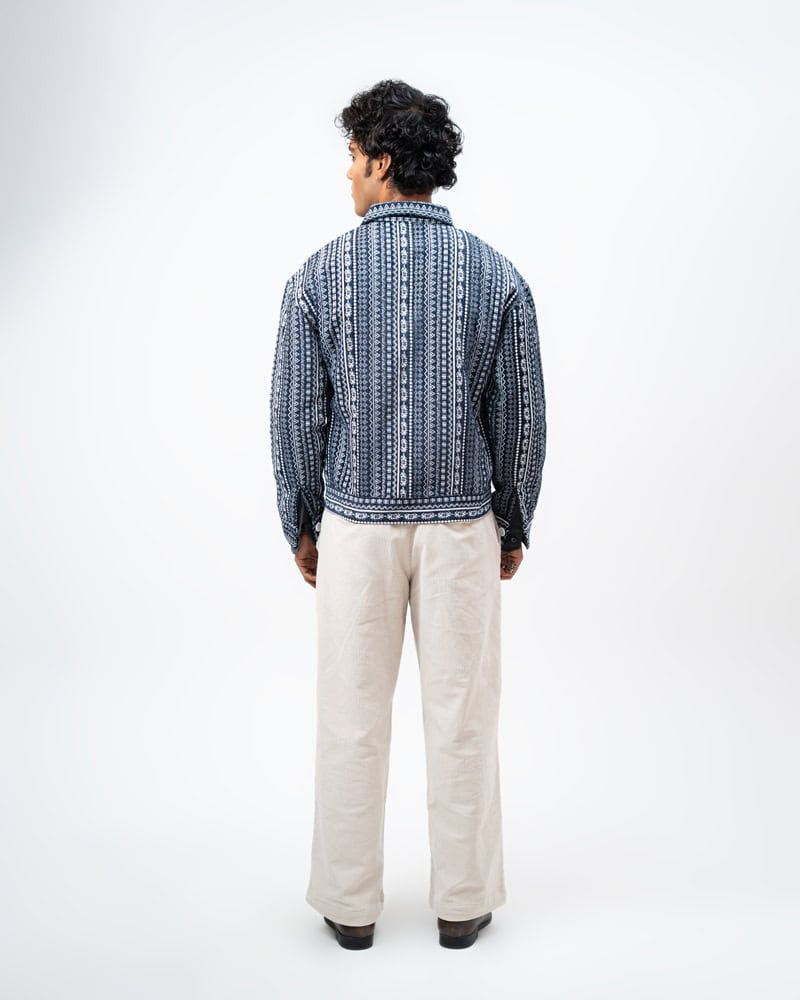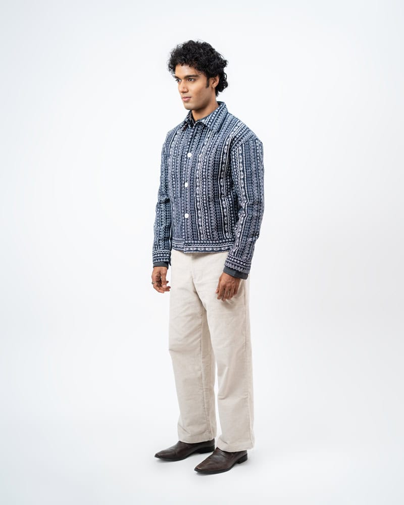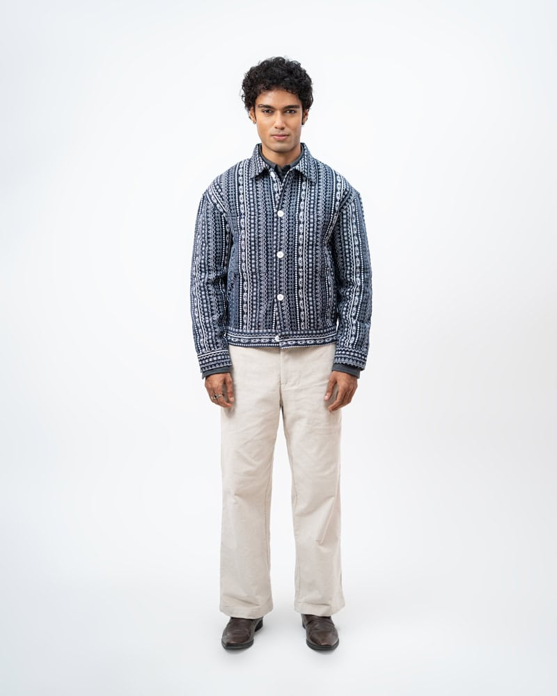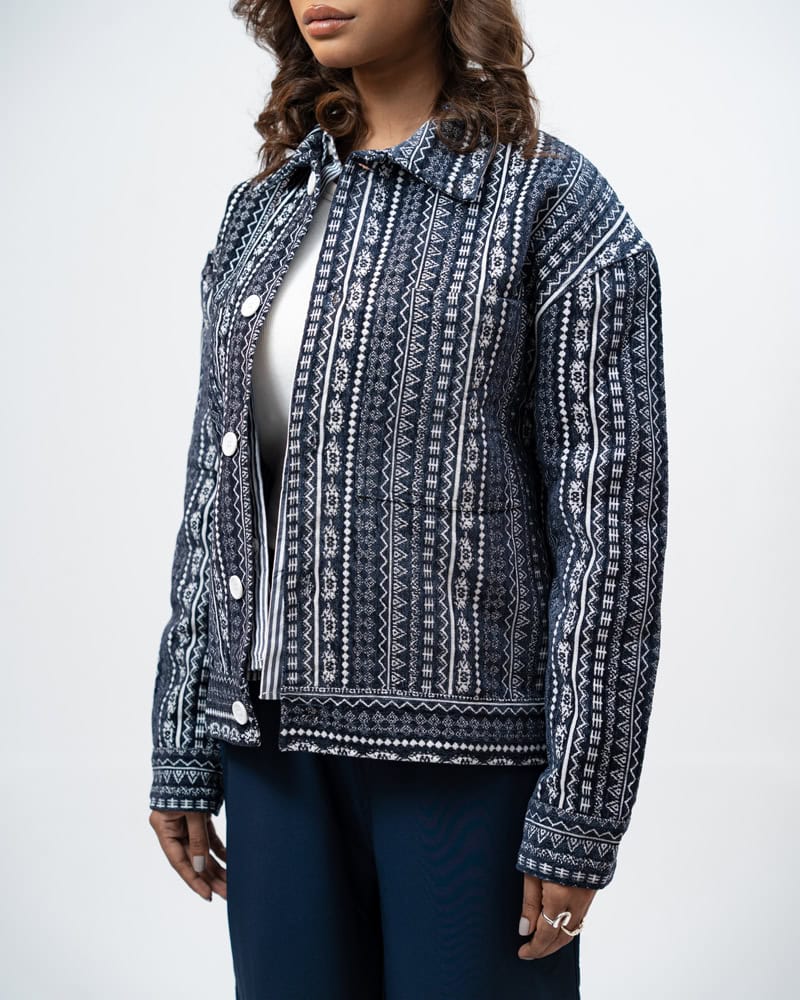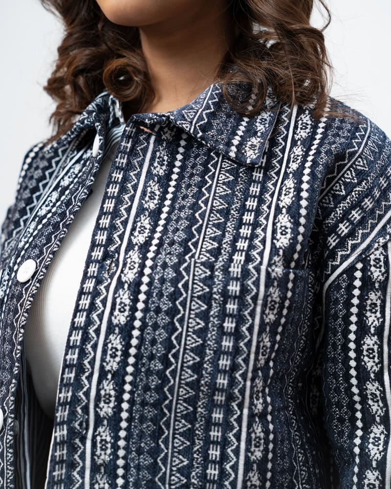 Channel an earthy eclectic energy with a layer that demands a second look. The Aztec Weave Jacket in Navy Blue by Gorur Ghash is defined by its intricate, Aztec-inspired woven design that feels like a modern tapestry. It acts as a true statement piece, adding immediate depth and organic texture to any daily rotation.