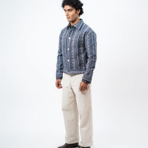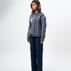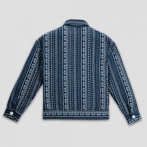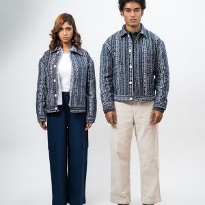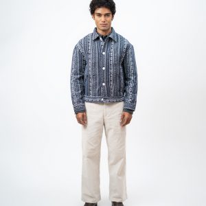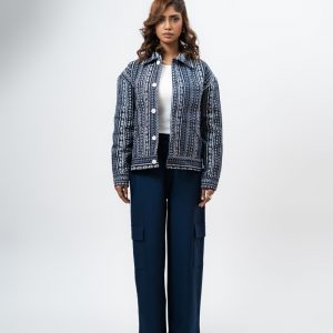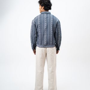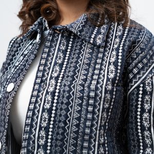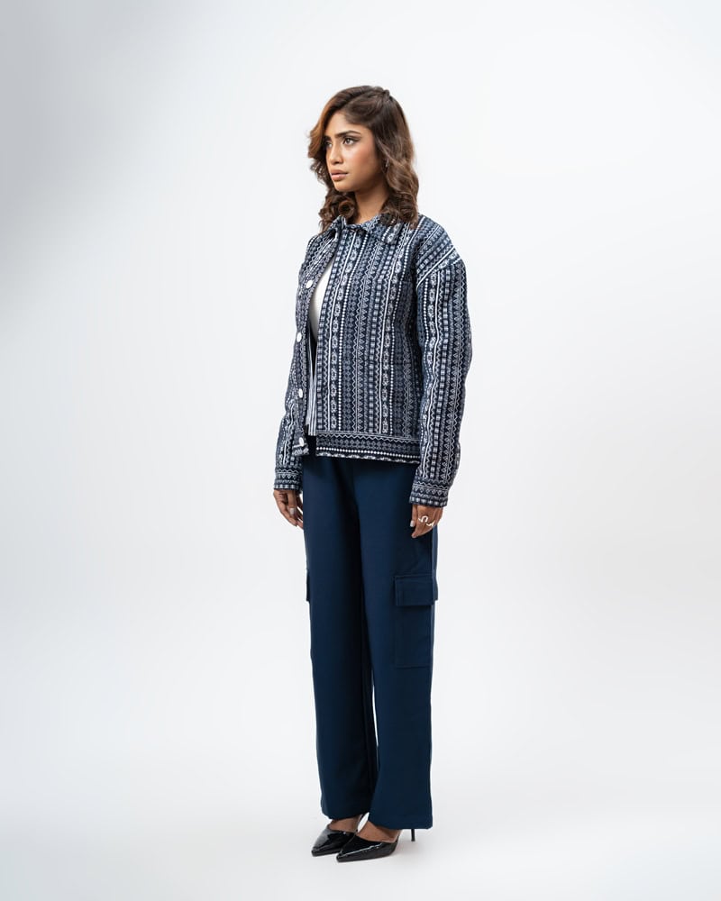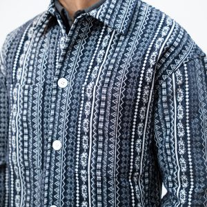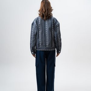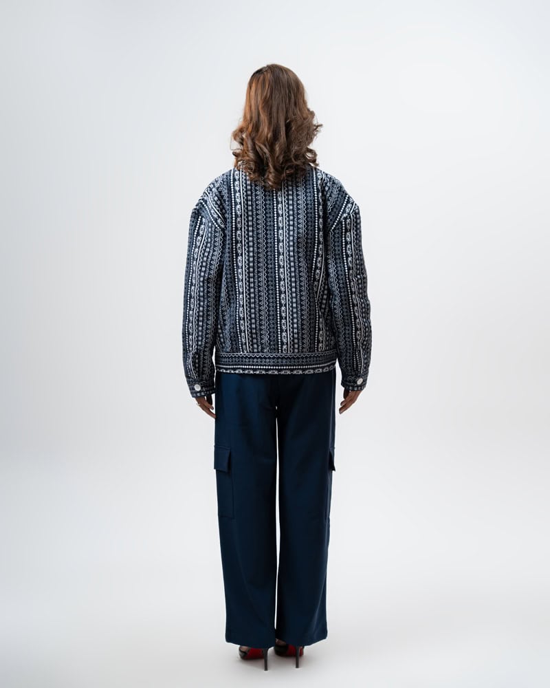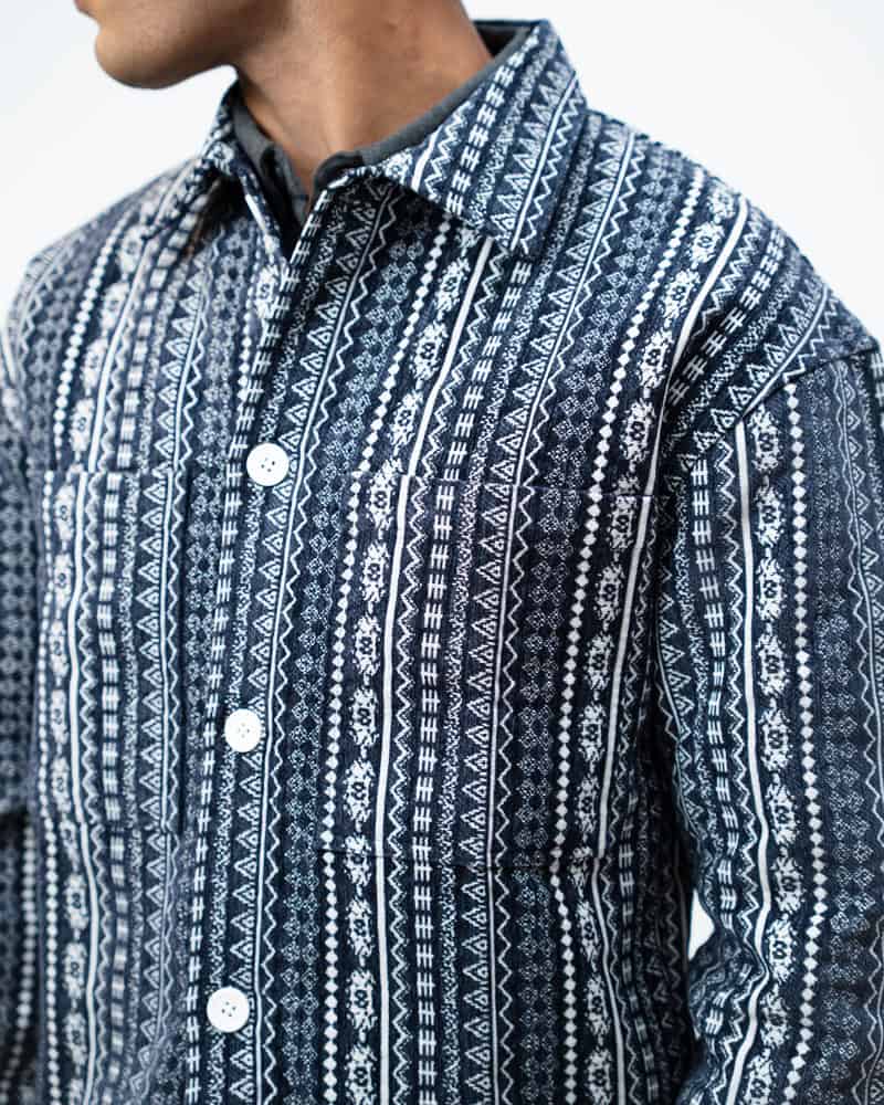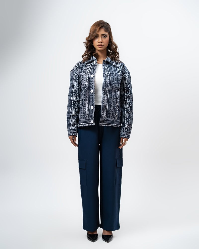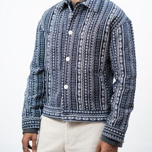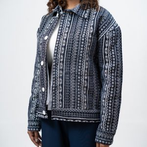 Channel an earthy eclectic energy with a layer that demands a second look. The Aztec Weave Jacket in Navy Blue by Gorur Ghash is defined by its intricate, Aztec-inspired woven design that feels like a modern tapestry. It acts as a true statement piece, adding immediate depth and organic texture to any daily rotation.