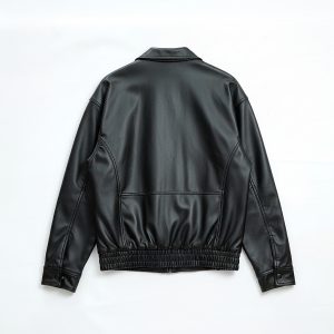 The Classic Faux Leather jacket in Black by Gorur Ghash delivers pure vintage attitude. This redesigned unisex essential cuts a relaxed figure with dropped shoulders and a sharp collar that anchors the retro look. Arched piping lines curve down the front and back for bold structural definition. A metal full zip sits behind a protective flap that buttons down for a seamless finish, while elasticated side hems ensure a perfect fit without restriction.