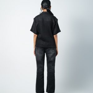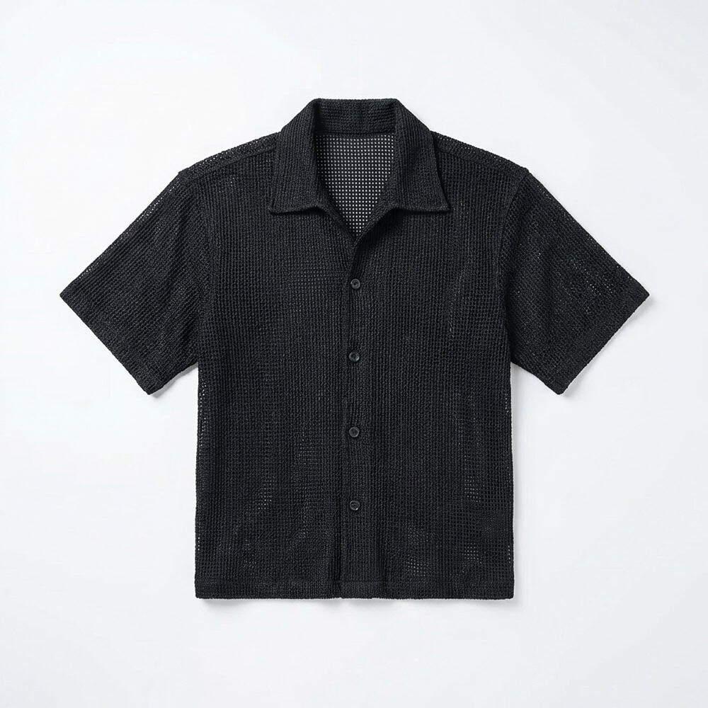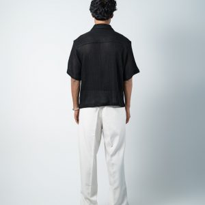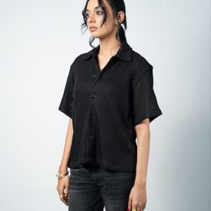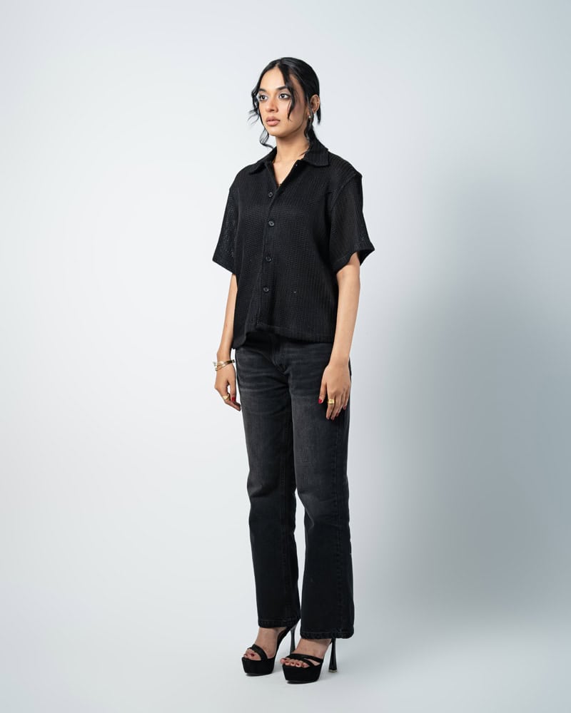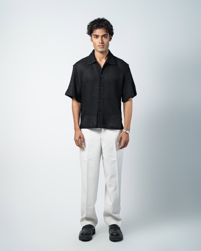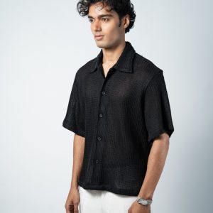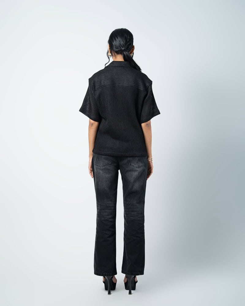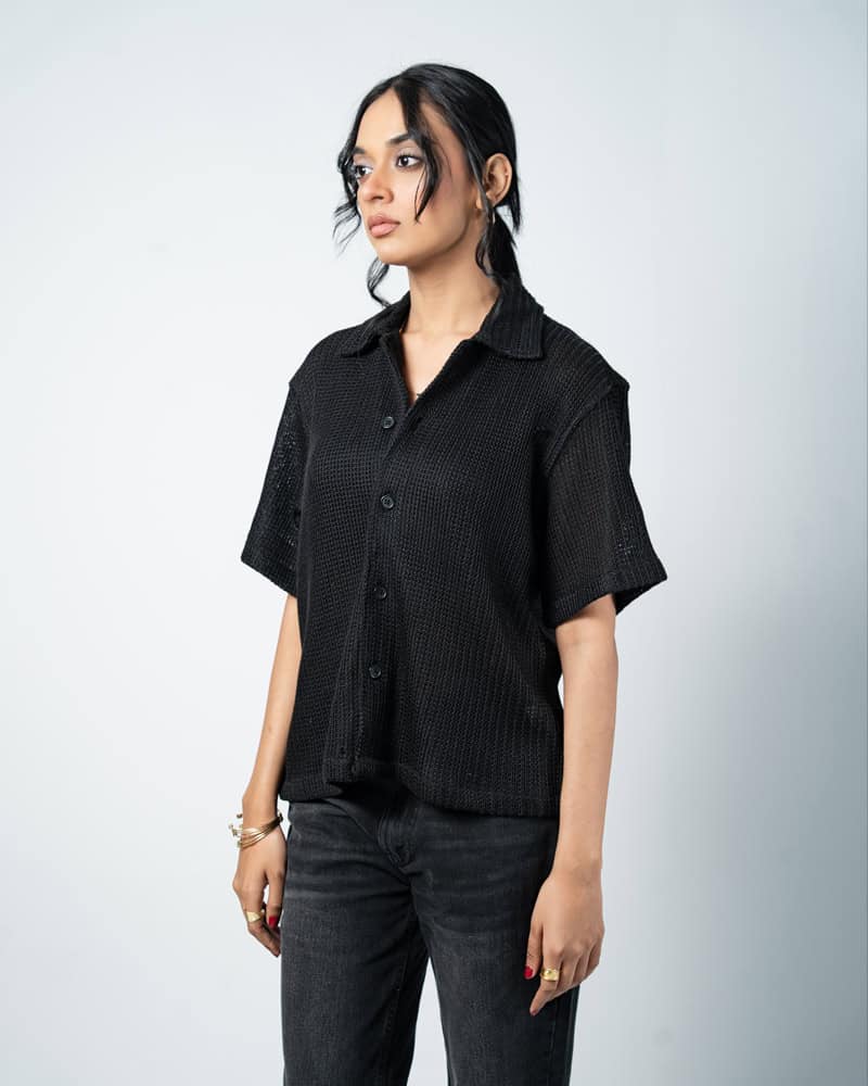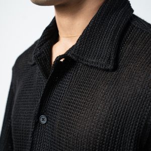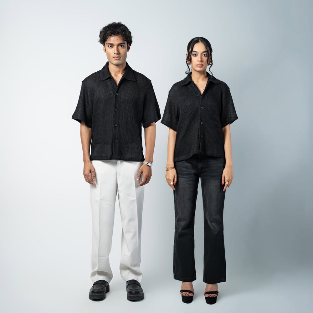 Designed with a slightly oversized collar for a modern edge, this unisex crochet shirt blends structure with laid-back style. Wear it open over a tee or buttoned for a refined look. Cool, comfy, and effortlessly bold, turn comfort into a statement with the Crochet Shirt in Black.