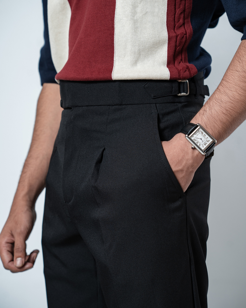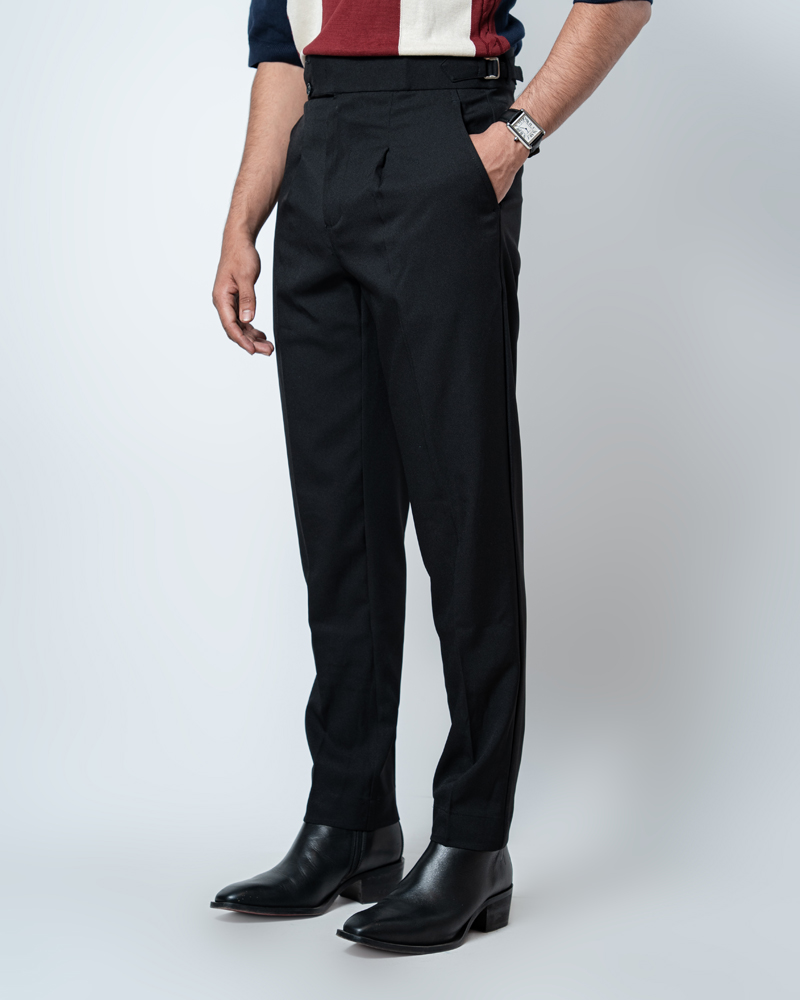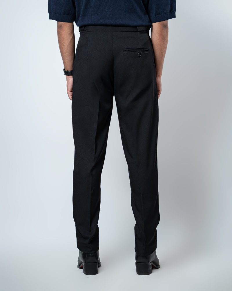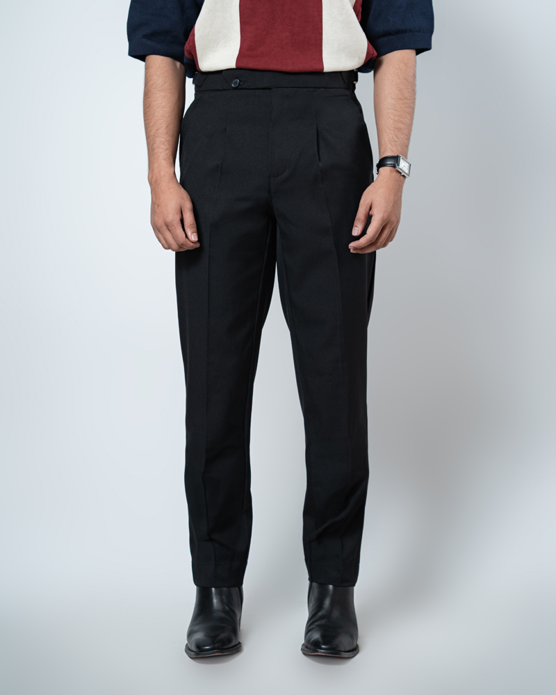 The standout feature of these redesigned Gurkha pants is the more prominent pleats, adding a distinguished touch that sets them apart from ordinary formal trousers. These defined pleats not only enhance the visual appeal but also allow greater ease of movement. The adjustable waistband, paired with the newly extended belt, ensures a personalized fit, offering both style and practicality. Our updated straight-fit design strikes the perfect balance between modern and classic, making these pants versatile enough to pair with a wide range of shirts and polos. The black color adds a refined, neutral tone that complements any wardrobe, giving you endless styling possibilities.