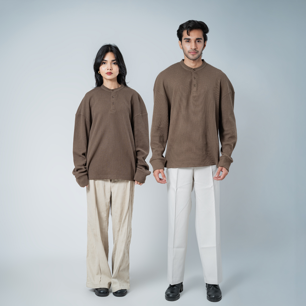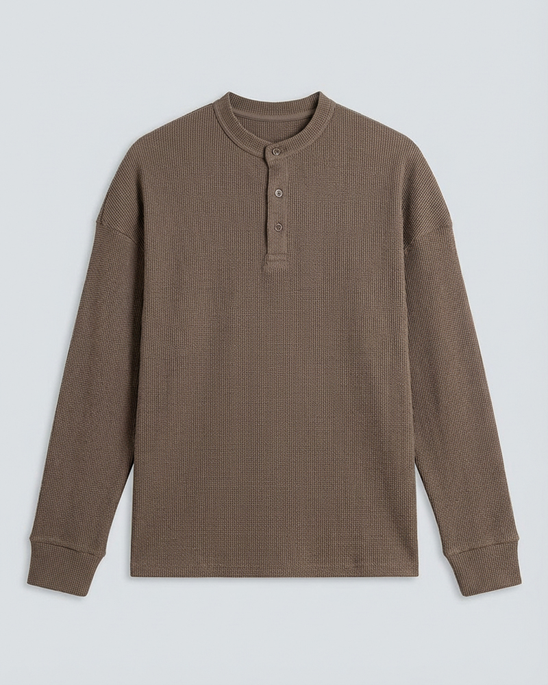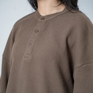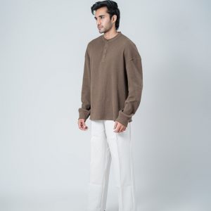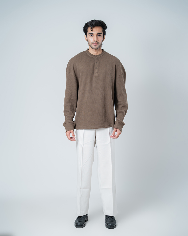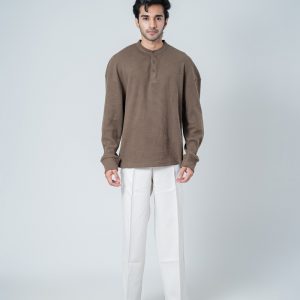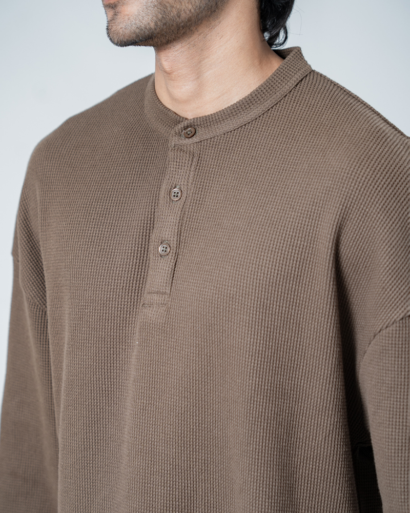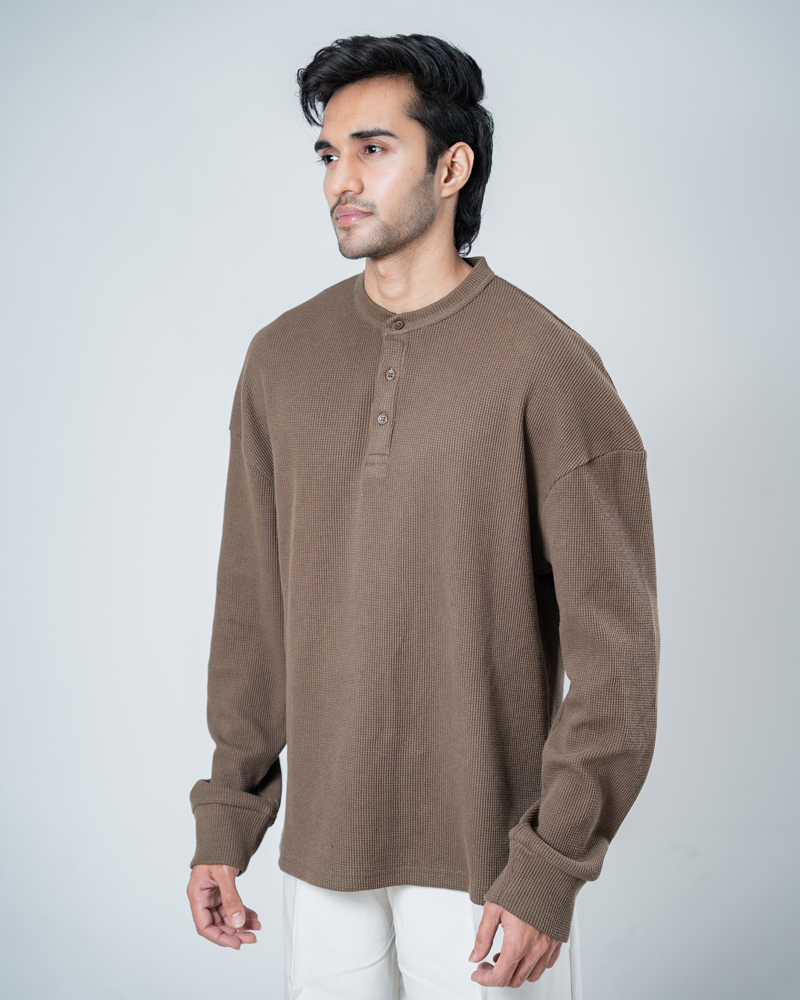Introducing the Unisex Henley Full Sleeve Waffle Textured T-shirt in Brown by Gorur Ghash, where texture meets everyday style. With a regular fit and dropped shoulders, it balances relaxed ease with subtle structure. The Brown color and waffle texture add visual interest, while the Henley-button neckline introduces a hint of classic charm. Perfect for city walks, weekend adventures, or relaxed outings.