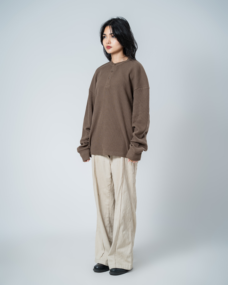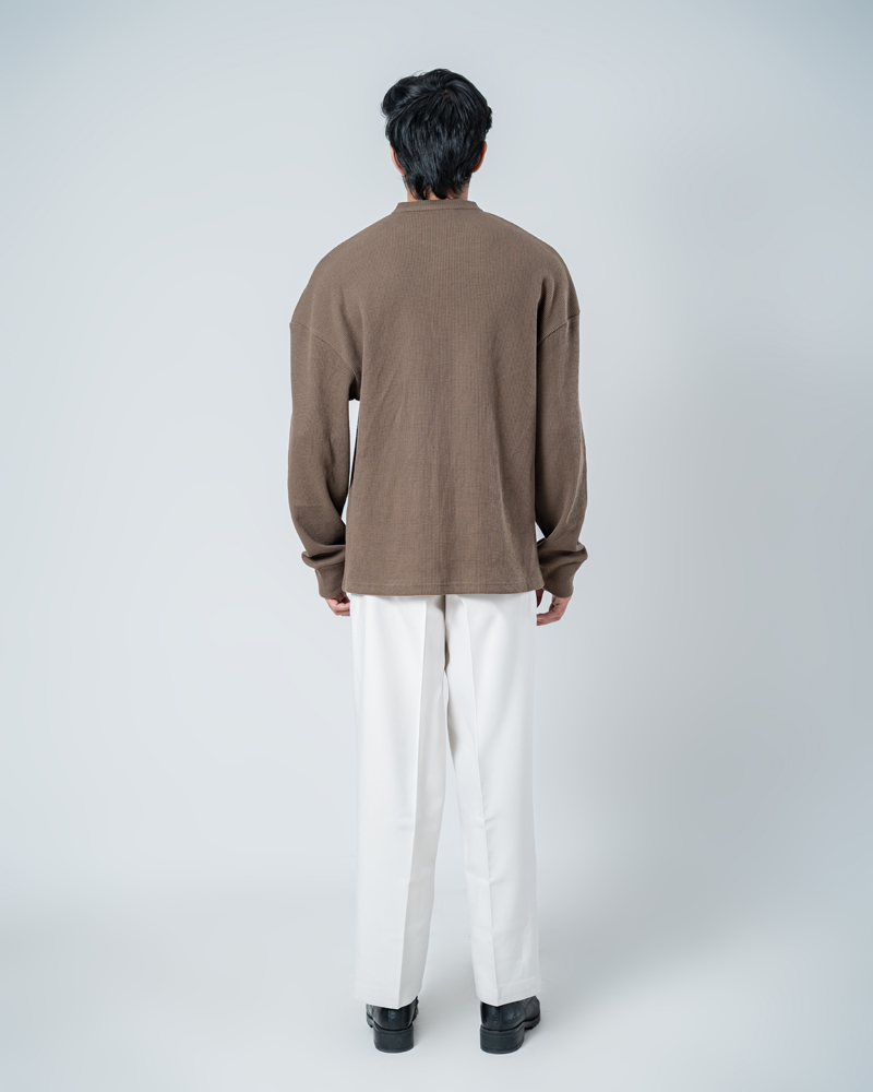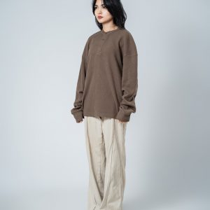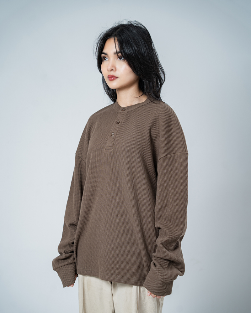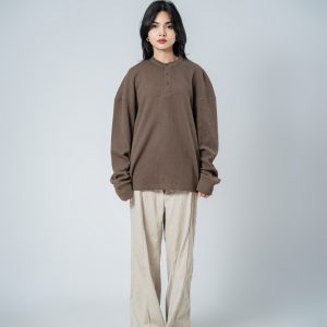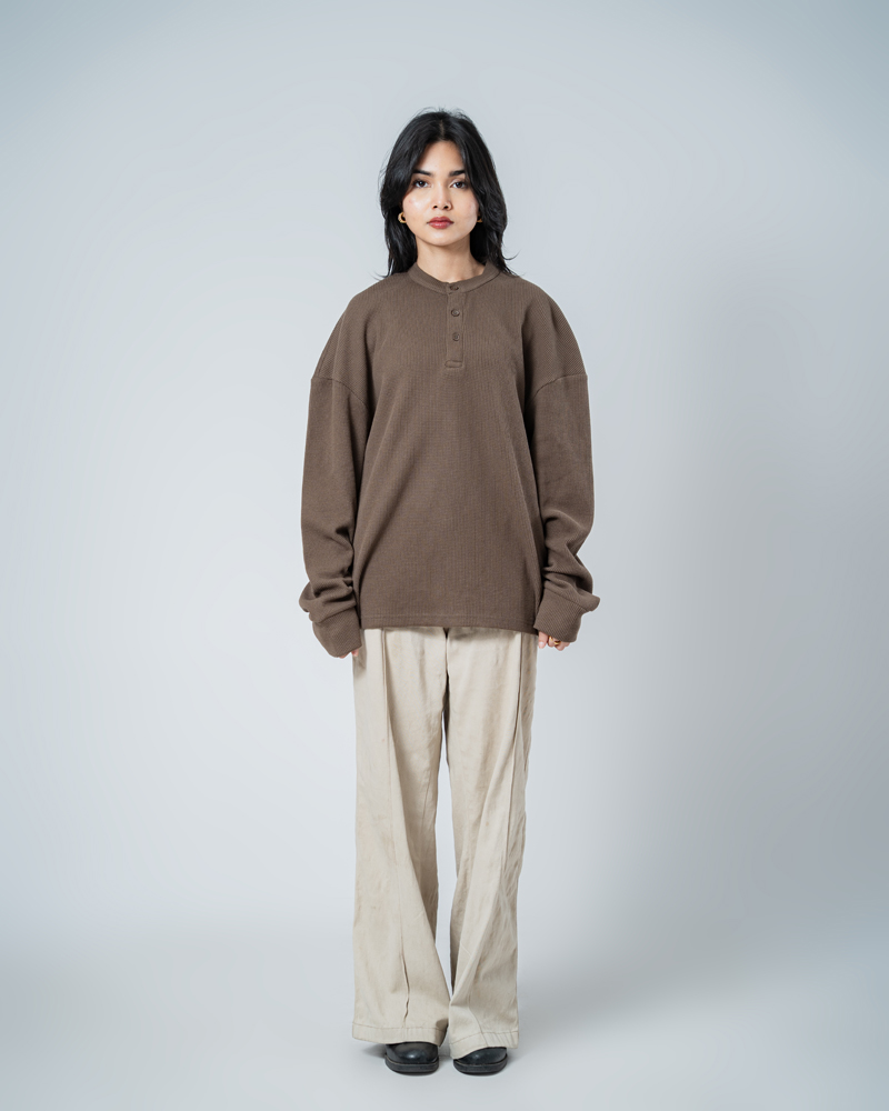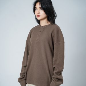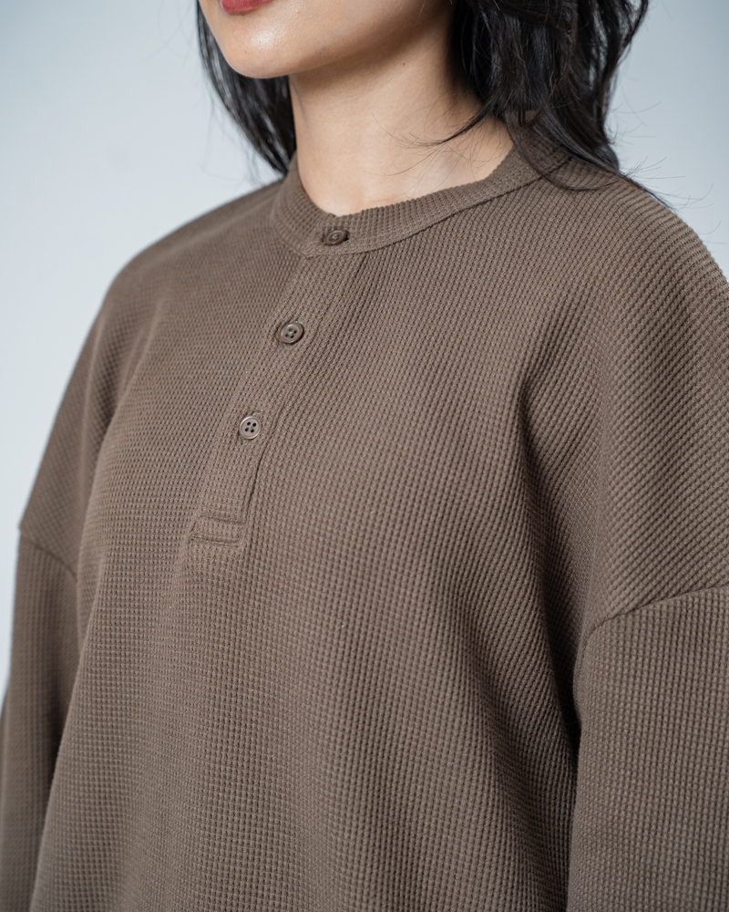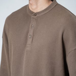 Introducing the Unisex Henley Full Sleeve Waffle Textured T-shirt in Brown by Gorur Ghash, where texture meets everyday style. With a regular fit and dropped shoulders, it balances relaxed ease with subtle structure. The Brown color and waffle texture add visual interest, while the Henley-button neckline introduces a hint of classic charm. Perfect for city walks, weekend adventures, or relaxed outings.