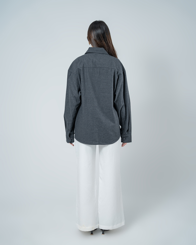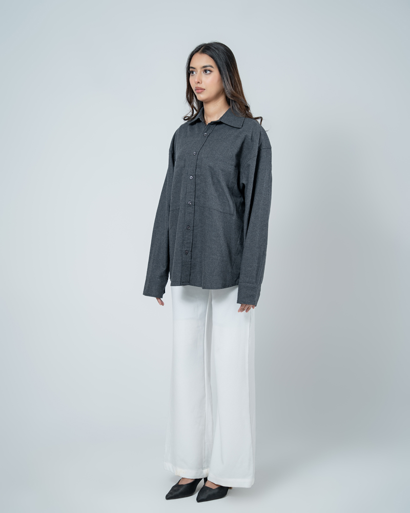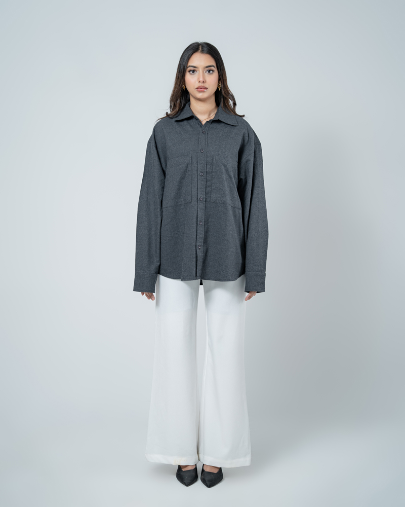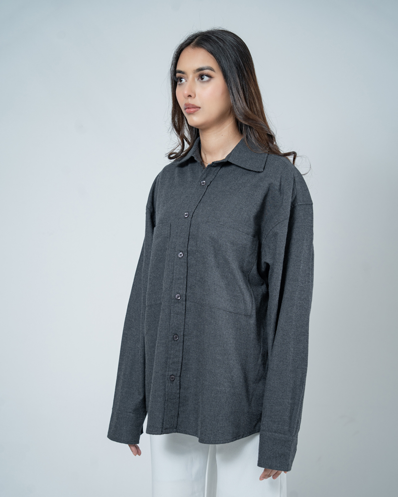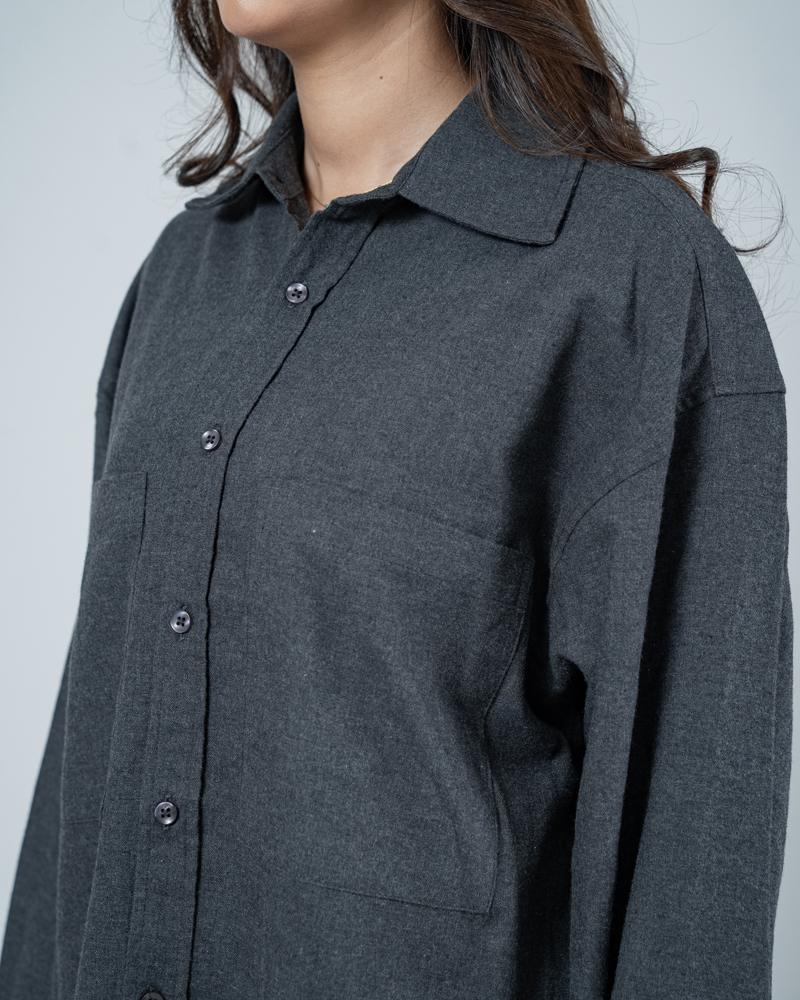 Crafted from breathable, high-quality cotton, this shirt features a deep grey hue that brings a grounded, versatile edge to any outfit. The unisex, oversized silhouette is defined by dropped shoulders and a straight-cut hem, ensuring a comfortable, gender-neutral fit. This shirt layers perfectly over a tee or stands alone as a statement piece. Functional dual chest pockets add a touch of workwear aesthetic, blending utility with a clean, modern finish. Whether you’re hitting the city streets or keeping it low-key, this unisex shirt is built for those who value both style and substance.