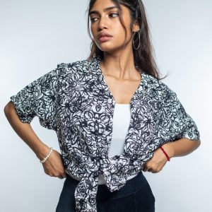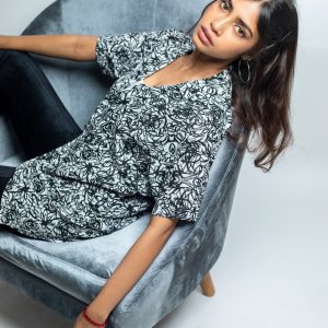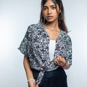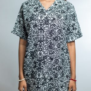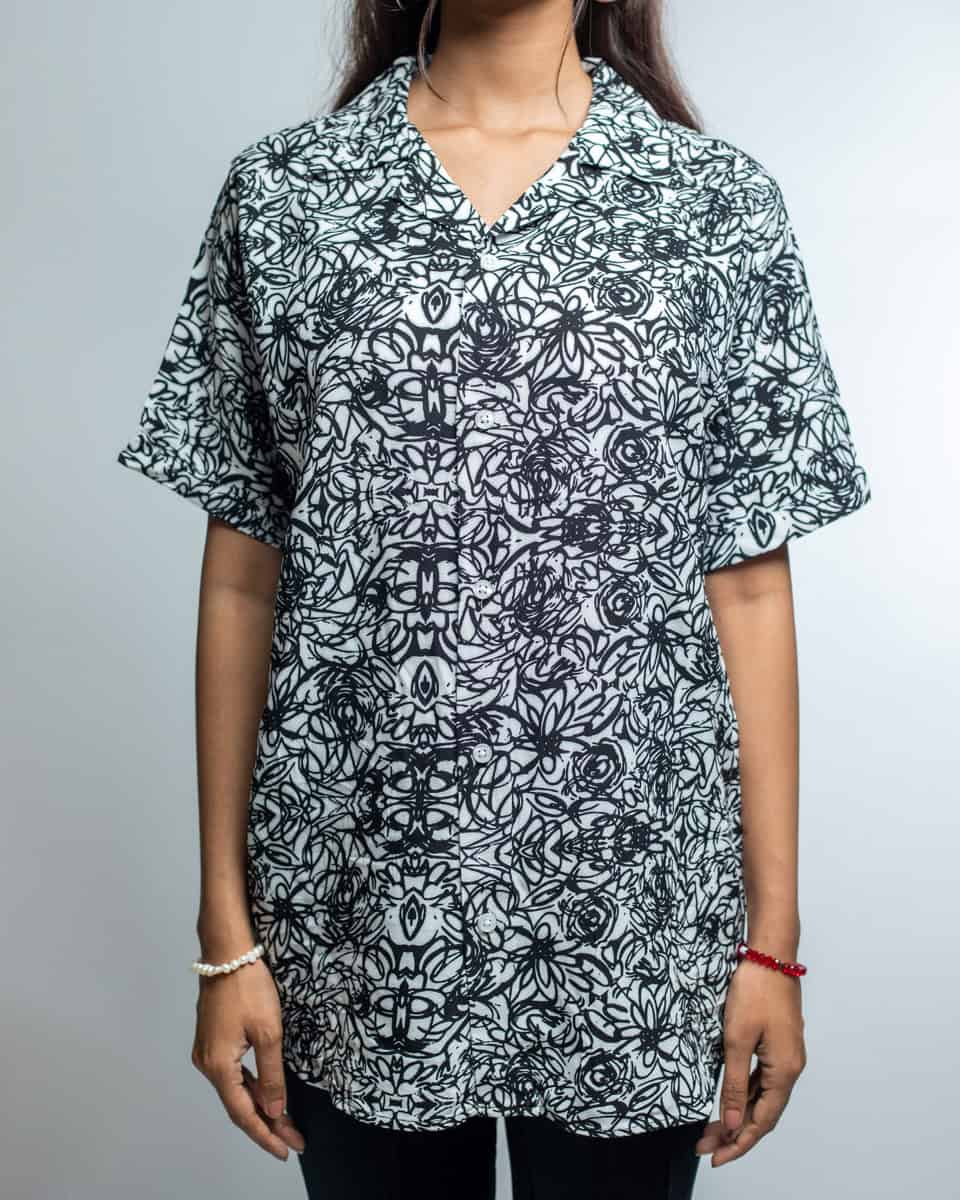 Introducing the Women’s Black & White Scribble Printed Oversized Drop shoulder Cuban Shirt by Gorur Ghash– the perfect way to show off your style and personality while staying comfortable!