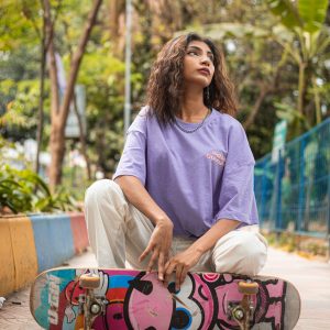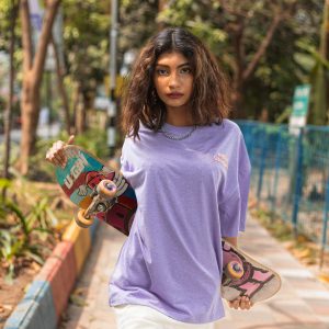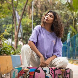 As Gen Zs, we mask our ill fate with humour and sarcasm. With Gorur Ghash’s light violet oversized drop shoulder T-shirt, let your tee do the talking for you and help overcome your internal struggles.