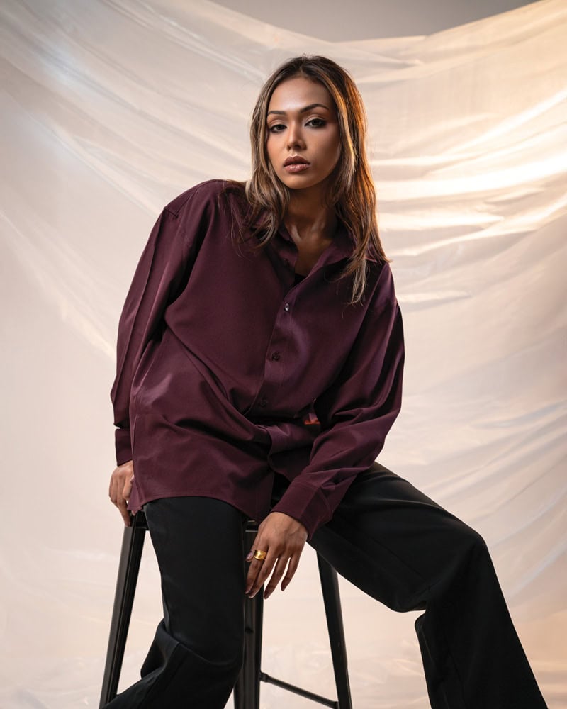Made from microstitch polyester (fancy talk for “feels smooth and breathable”), this shirt doesn’t just look good—it moves with you. It’s stretchable, which means you can reach for that last slice of pizza or wave at someone from across the street without feeling like you’re trapped in a fashion prison. Light, flowy, and breathable—this is the shirt your summer wardrobe has been dreaming of. And yes, it’s oversized—because fitted shirts are great until you want to actually breathe. The roomy cut gives you that relaxed, effortlessly stylish look while keeping things classy. No clinging, no pulling—just pure, breezy confidence. The solid wine maroon color and smooth finish give it a touch of refinement, making it perfect for casual days, work-from-café hours, or even a date where you want to look like you made an effort (without really making one).